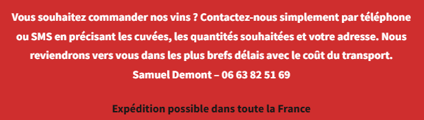 Vous souhaitez commander nos vins ? Contactez-nous simplement par téléphone ou SMS en précisant les cuvées, les quantités souhaitées et votre adresse. Nous reviendrons vers vous dans les plus brefs délais avec le coût du transport.